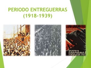 El documento resume el período entre las Primeras y Segundas Guerras Mundiales (1918-1939). Políticamente se caracterizó por la crisis de las democracias liberales y el ascenso de fascismos. Económicamente vio la recuperación después de la Primera Guerra Mundial y una euforia en los años 20, pero luego el Crack de 1929 causó una profunda crisis en los años 30. Este período condujo a la Segunda Guerra Mundial.