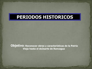 El documento resume los tres períodos clave de la independencia de Chile: la Patria Vieja (1810-1814), la Reconquista española (1814-1817) y la Patria Nueva (1817-1823). Durante la Patria Vieja se formó la primera Junta de Gobierno, el primer Congreso Nacional y hubo varias batallas entre patriotas y realistas, culminando en la derrota patriota en Rancagua en 1814. Luego vino la Reconquista española hasta 1817. Finalmente, durante la Patria Nueva
