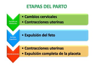 El documento describe las etapas del parto, incluyendo la dilatación cervical, la expulsión del feto y la placenta. El parto se divide en tres períodos principales: 1) dilatación cervical, 2) expulsión del feto, y 3) expulsión de la placenta. Cada período tiene varias fases y es monitoreado de cerca por el personal médico.