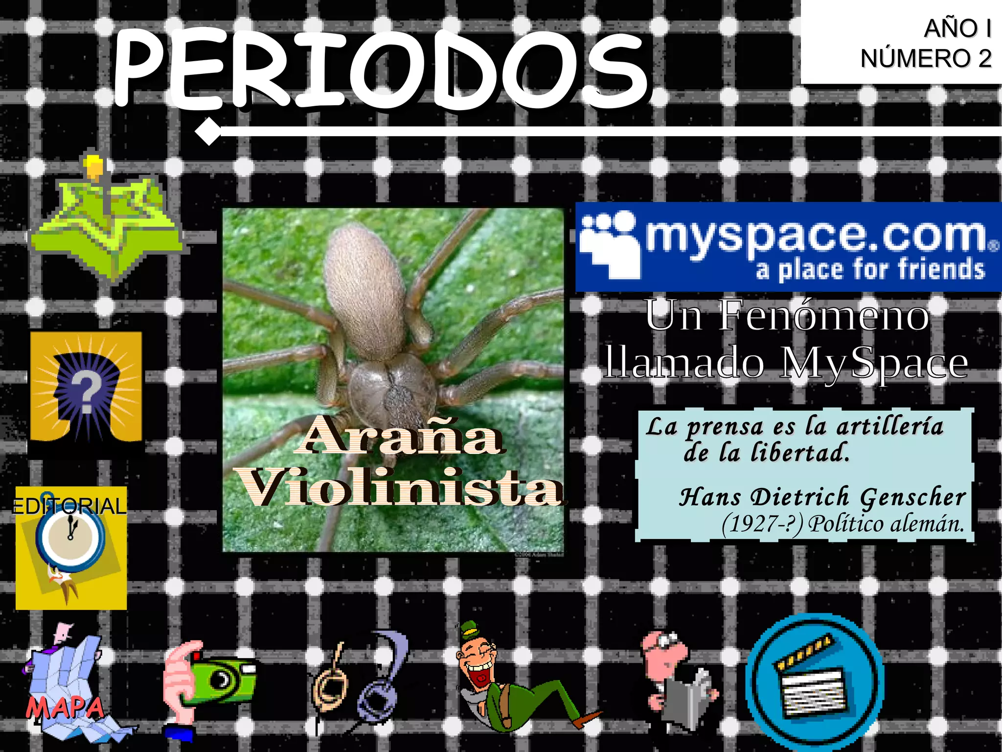 El documento presenta un resumen de la revista "Periodos" número 2. Incluye reportajes sobre la araña violinista, incluyendo sus características y riesgos, y sobre la página web MySpace, describiendo sus funciones y popularidad. También anuncia otras secciones como música y un artículo sobre México. El editor agradece a los lectores y los invita a disfrutar la revista.