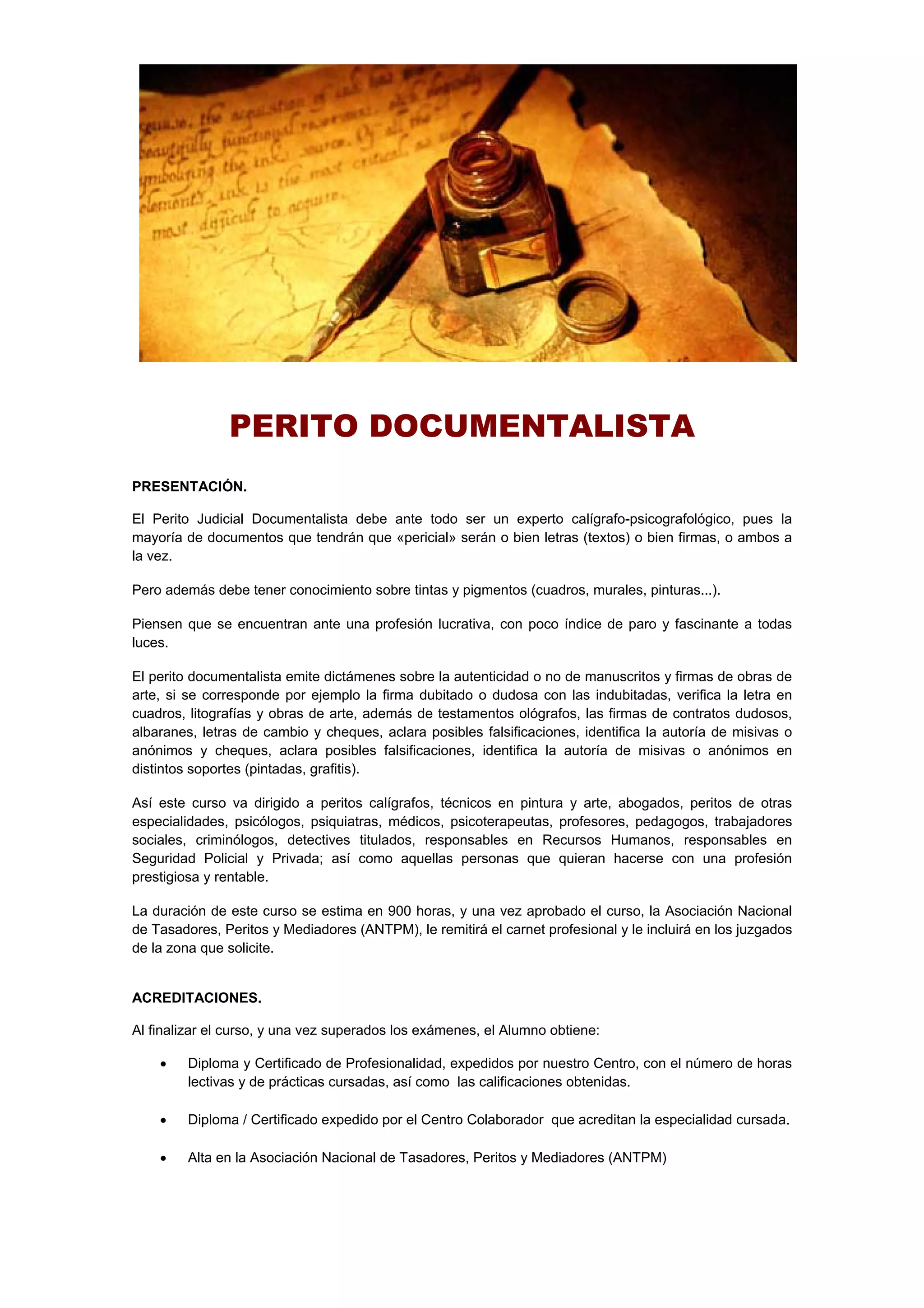 Este documento presenta un curso para peritos documentalistas. El curso cubre temas como caligrafía forense, identificación de documentos, análisis de tintas y pigmentos, historia del libro y el papel, fotografía forense, y legislación relacionada con obras de arte. El curso dura 900 horas y una vez aprobado otorga una certificación profesional que habilita a los graduados para trabajar como peritos documentalistas.