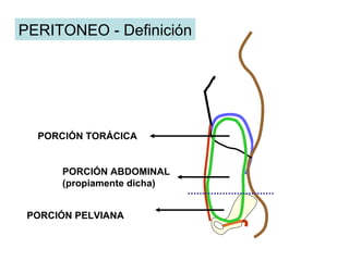 El documento resume las principales características del peritoneo, incluyendo sus porciones, repliegues y funciones. Describe el mesenterio, los epiplones menor y mayor, y el peritoneo de órganos como el hígado, bazo y útero. Explica cómo el peritoneo forma repliegues que unen los órganos entre sí y a las paredes abdominales, transportando vasos sanguíneos.