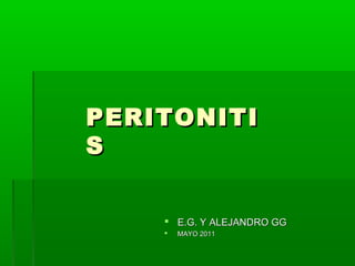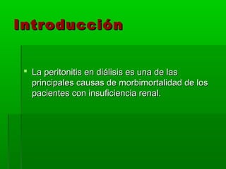 Este documento habla sobre la peritonitis en pacientes en diálisis peritoneal. Define la peritonitis y sus diferentes tipos. Explica las causas más comunes, los microorganismos involucrados, formas de prevención, evaluación del paciente, tratamiento empírico y específico, y complicaciones. El objetivo principal es prevenir y tratar adecuadamente la peritonitis para reducir la morbilidad y mortalidad en estos pacientes.