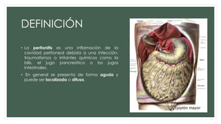 La peritonitis es una inflamación de la cavidad peritoneal causada por infecciones, traumatismos o irritantes químicos. Puede ser localizada o difusa. El diagnóstico se basa en el estudio del líquido peritoneal obtenido por paracentesis. El tratamiento incluye antibióticos de amplio espectro de forma empírica. La prevención y el tratamiento quirúrgico adecuado son fundamentales para reducir las tasas de infección.