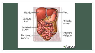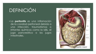La peritonitis es una inflamación de la cavidad peritoneal causada por infecciones, traumatismos o irritantes químicos. Puede ser localizada o difusa. Los síntomas incluyen dolor abdominal, fiebre y náuseas. El diagnóstico se basa en el análisis del líquido peritoneal. El tratamiento implica antibióticos de amplio espectro de forma empírica. Existen diferentes tipos como primaria, secundaria y terciaria dependiendo de su causa.