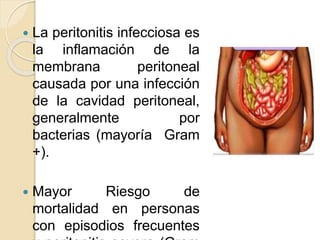 La peritonitis infecciosa es la inflamación de la membrana peritoneal causada por una infección bacteriana en la cavidad peritoneal. Las bacterias llegan a través del catéter peritoneal, la pared intestinal o desde focos infecciosos distantes. La prevención incluye medidas asépticas durante la inserción del catéter, cuidados del orificio de salida y profilaxis antibiótica para procedimientos invasivos.