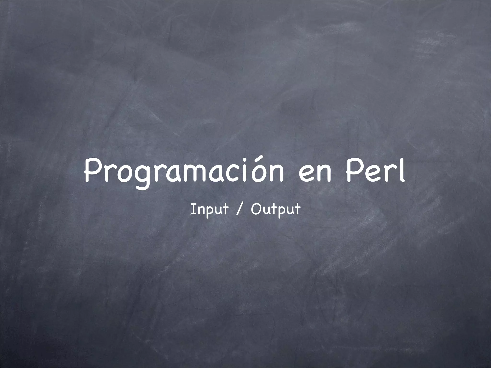 El documento describe las operaciones de entrada/salida en Perl, incluyendo la lectura de entrada estándar, la apertura y lectura/escritura de archivos, y el uso del selector por defecto. Explica cómo el operador <STDIN> lee líneas de entrada, mientras que <> lee líneas de múltiples archivos especificados como argumentos. También cubre temas como control de errores, buffering y almacenamiento de manejadores en variables escalares.