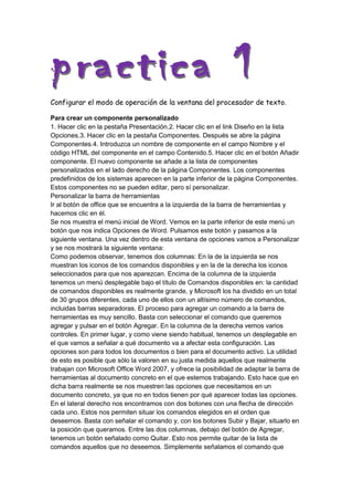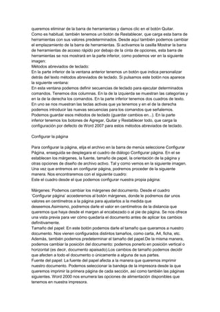 Este documento describe cómo configurar diferentes aspectos de un documento de Microsoft Word, incluyendo la barra de herramientas, los estilos de párrafo, los saltos de página y la configuración de página. Explica cómo personalizar la barra de herramientas agregando y eliminando comandos, y cómo definir atajos de teclado. También cubre cómo establecer márgenes, tamaño y orientación de página, y diferentes opciones de diseño y estilos de párrafo.