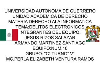 Este documento describe los delitos electrónicos y los elementos que los componen. Explica que un delito electrónico implica cometer actos ilegales a través de una computadora. Los elementos de un delito son que sea un acto humano antijurídico tipificado y sancionado por la ley. Los delitos informáticos implican usar una computadora de manera dañina o no autorizada. El Código Penal Federal en el artículo 211bis 1 sanciona modificar, destruir o causar pérdida de información protegida sin autorización.