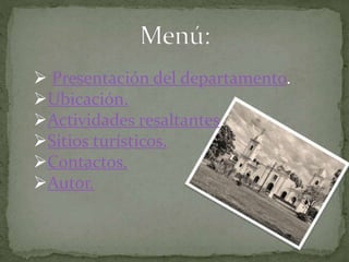 El documento presenta información sobre el departamento de Paraguarí en Paraguay. Ubicado a 66 km de Asunción, la capital, Paraguarí tiene una población de 239,633 habitantes dedicados principalmente a la agricultura y la ganadería. Algunos de los principales atractivos turísticos son el Templo Santo Tomás, antiguas casonas y el Museo de la Artillería. El departamento se caracteriza por su abundante naturaleza que incluye varias cordilleras y cerros.