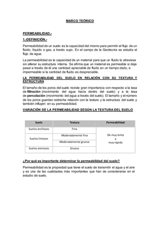 1) La permeabilidad es la capacidad de un suelo para permitir el flujo de agua a través de él. Depende del tamaño y número de poros del suelo, los cuales están relacionados con la textura y estructura del suelo.