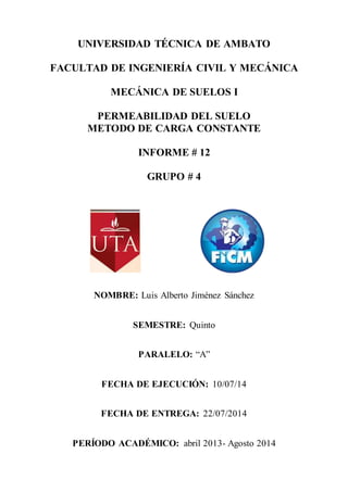 Este documento presenta los resultados de una prueba de permeabilidad de suelo utilizando el método de carga constante. Se midió el tiempo que tardó el agua en atravesar una muestra de suelo de 5.8 cm de longitud bajo una carga hidráulica constante. El coeficiente de permeabilidad calculado fue de 1,033x10-2 cm/seg, indicando que el suelo tiene una permeabilidad media. Adicionalmente, se observó que el coeficiente de permeabilidad disminuye a medida que disminuye la temperatura.
