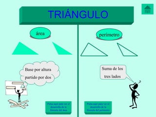 El documento presenta las fórmulas para calcular el área y perímetro de diferentes figuras geométricas como triángulos, cuadrados, rectángulos, rombos, trapecios, círculos y circunferencias. Explica cómo calcular el área multiplicando las medidas apropiadas y el perímetro sumando los lados. Proporciona ejemplos numéricos para ilustrar cada fórmula.