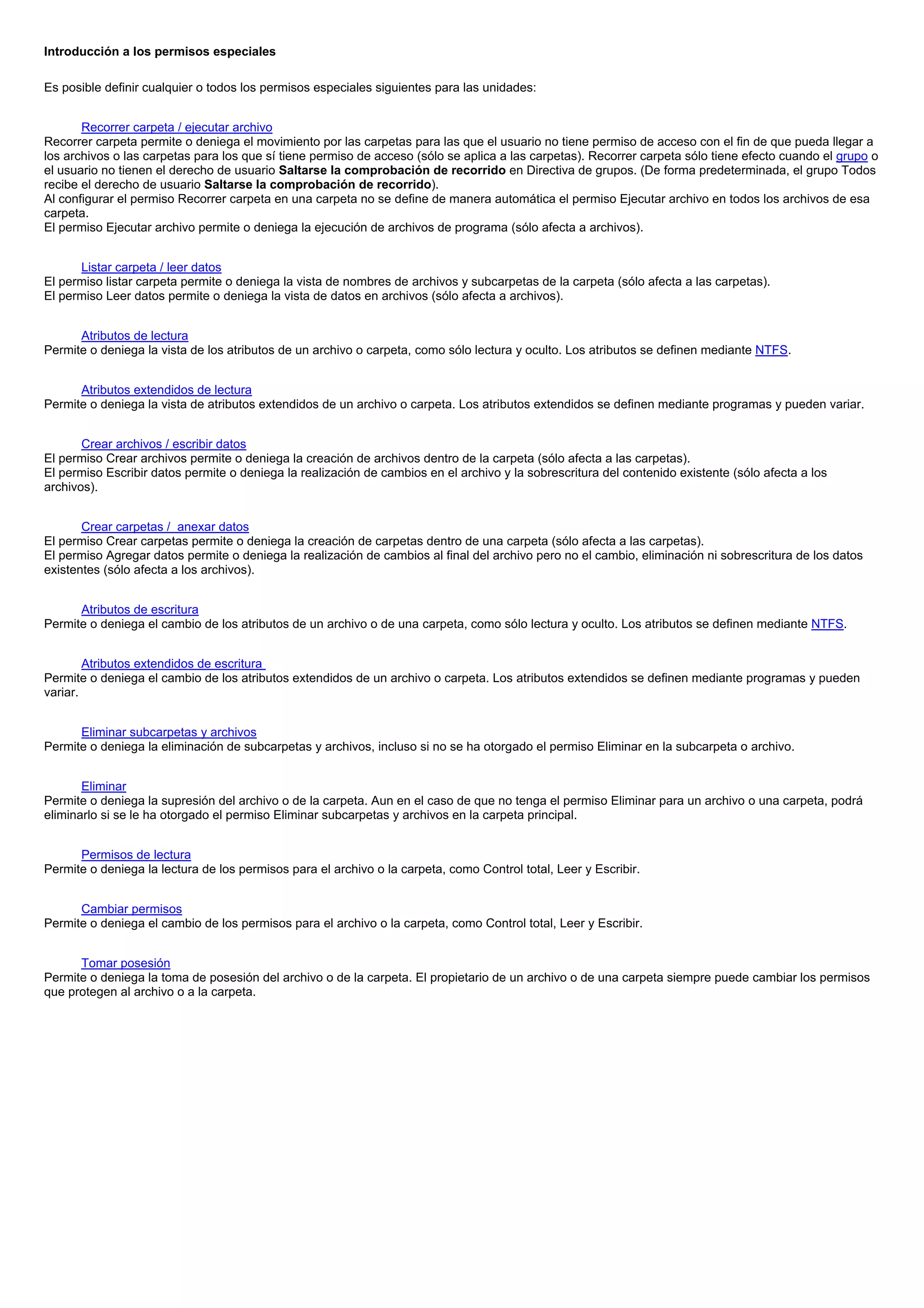 Este documento describe los diferentes permisos especiales que se pueden definir para archivos y carpetas en Windows, incluyendo permisos para recorrer carpetas, enumerar contenido, leer/escribir datos y atributos, crear/eliminar archivos y carpetas, y cambiar permisos. También explica cómo los permisos especiales se agrupan en permisos de carpeta y archivo comunes como Control Total, Modificar, Leer y Ejecutar. Finalmente, detalla cómo aplicar permisos a objetos individuales o de forma recursiva a subcarpetas y
