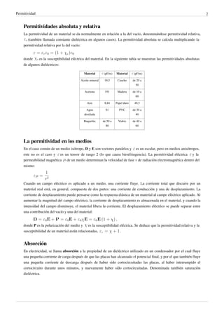La permitividad describe cómo un material polariza ante un campo eléctrico y afecta el campo. La permitividad del vacío es una constante y la permitividad relativa mide la polarizabilidad de un material en comparación con el vacío. La permitividad absoluta de un material se calcula multiplicando su permitividad relativa por la del vacío.