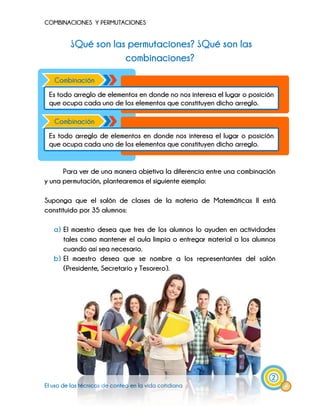 Este documento explica la diferencia entre combinaciones y permutaciones. Las combinaciones son arreglos de elementos donde no importa el orden, mientras que en las permutaciones sí importa el orden. También presenta fórmulas para calcular el número de combinaciones y permutaciones posibles y provee ejemplos para ilustrar su uso.