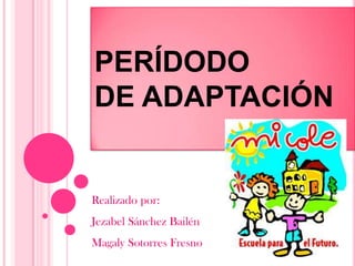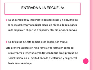 Este documento describe el período de adaptación que experimentan los niños al entrar a la escuela. Explica que este cambio conlleva la separación de la familia y puede causar sentimientos de abandono e inseguridad en los niños. También destaca la importancia de que los padres preparen a los niños y les transmitan una imagen positiva de la escuela para facilitar la adaptación.