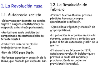 El documento resume los principales acontecimientos políticos y socioeconómicos en Europa y Estados Unidos durante el período de entreguerras (1919-1939). Incluye la Revolución Rusa de 1917 que llevó al poder a los bolcheviques, la creación de la Unión Soviética bajo el liderazgo de Stalin, el ascenso del fascismo en Italia bajo Mussolini, la instauración del régimen nazi en Alemania con Hitler, y la prosperidad económica seguida por la Gran Depresión en Estados Unidos.