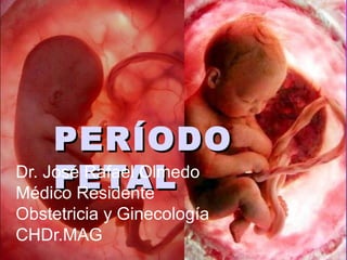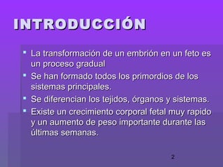 Este documento describe las características del desarrollo fetal en diferentes períodos gestacionales, incluyendo cambios en el tamaño, proporciones del cuerpo, sistema óseo, sistema nervioso y otros órganos. No existe una clasificación formal, pero se describen cambios importantes cada 4-5 semanas, como el desarrollo de los pulmones y sistema nervioso central para viabilidad extrauterina después de la semana 30.