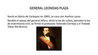 Este documento presenta resúmenes biográficos de varios presidentes y figuras políticas ecuatorianas, incluyendo Eloy Alfaro Delgado, Leonidas Plaza, Lizardo García, Alfredo Baquerizo Moreno, José Luis Tamayo y Gonzalo Córdova. Cubre aspectos como sus fechas de nacimiento, cargos políticos, logros de sus gobiernos y detalles biográficos clave.