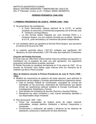 Durante la primera presidencia de Juan Perón entre 1946 y 1952, se implementaron numerosas reformas sociales y económicas. Se nacionalizaron servicios públicos como los ferrocarriles y teléfonos, se creó el Partido Peronista, se otorgó el voto femenino, y se promulgó una nueva constitución en 1949. La esposa de Perón, Eva Perón, fundó la Fundación Eva Perón para llevar a cabo importantes obras de bienestar social. Sin embargo, la presidencia de Perón también enfrentó una fuerte op