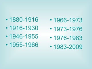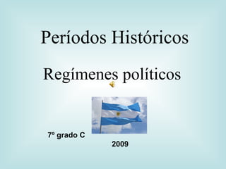 El documento describe la historia de Argentina entre 1880 y 2009, dividiéndola en diferentes períodos políticos. Entre 1880 y 1916 hubo un régimen oligárquico dominado por terratenientes, con un fuerte crecimiento económico basado en la exportación agrícola. Luego entre 1916 y 1930 gobernó la Unión Cívica Radical, triunfando Hipólito Yrigoyen en las primeras elecciones con voto secreto. Entre 1946 y 1955 se instauró el peronismo con Perón como presidente.