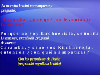 Una maestra se identifica como kirchnerista y pide a sus alumnos que levanten la mano si también lo son. Todos lo hacen excepto una niña. Cuando la maestra le pregunta por qué, la niña responde que es peronista. La maestra se sorprende y le dice que el peronismo ya pasó, pero la niña insiste que su familia también lo es. La maestra se irrita y le pregunta qué sería si su familia fuera corrupta, a lo que la niña responde que sería kirchnerista.