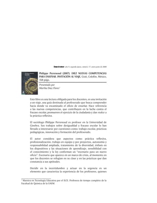 El documento reseña el libro 'Diez nuevas competencias para enseñar' de Philippe Perrenoud, que identifica competencias esenciales para el profesorado en un contexto educativo en evolución. Estas competencias buscan superar el fracaso escolar, fomentar el ejercicio de la ciudadanía y promover la reflexión en la práctica docente. Se destacan diez competencias prioritarias que los educadores deben cultivar para adaptarse a los desafíos contemporáneos y facilitar un aprendizaje significativo.