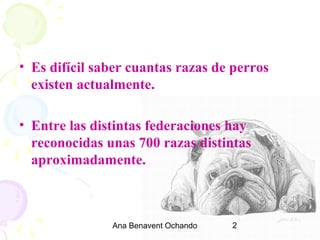 Este documento describe las diferentes razas de perros, clasificándolas por tamaño como gigantes, grandes, medianas, pequeñas y enanas. Explica algunas características representativas de razas populares como el San Bernardo, Mastín Español, Rottweiler y Beagle. También incluye tablas sobre la edad de los perros equivalente a la edad humana y la idoneidad de diferentes razas para vivir en apartamento.