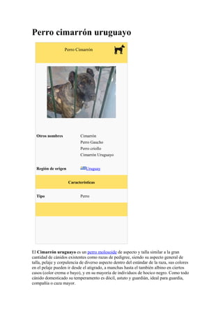 El perro cimarrón uruguayo es una raza originaria de Uruguay descendiente de perros asilvestrados. Fue reconocida como raza en 1989 y es símbolo del ejército uruguayo. Es un perro molosoide de tamaño mediano a grande y pelaje de colores variados, utilizado para el trabajo con ganado y la guardia.