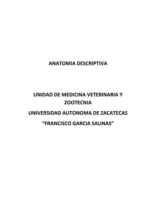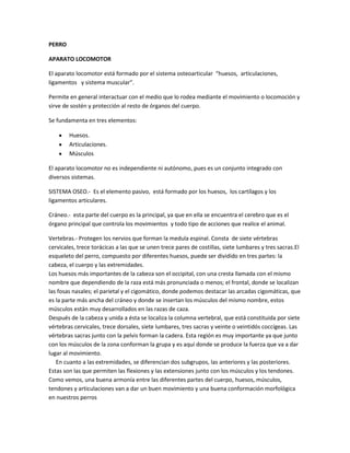 El documento describe la anatomía del aparato locomotor y sistema respiratorio del perro. El aparato locomotor está formado por el sistema osteoarticular (huesos, articulaciones, ligamentos y músculos) y permite el movimiento. El sistema respiratorio incluye la nariz, tráquea, pulmones y otros órganos que permiten el intercambio gaseoso en la sangre. Ambos sistemas trabajan juntos para apoyar la locomoción y proporcionar oxígeno al cuerpo.