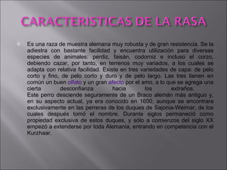 El documento describe al perro de muestra alemán Weimaraner. Es una raza robusta y resistente que se adiestra fácilmente para cazar diferentes tipos de animales en terrenos variados. Existe en tres variedades de pelaje y tiene un buen olfato y afecto por su amo, aunque es desconfiado con extraños. Se originó a partir de un perro de caza alemán más antiguo y fue conocido en el siglo XVII como propiedad exclusiva de los duques de Sajonia-Weimar.