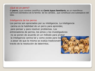 Los perros son mamíferos carnívoros domesticados que descienden del lobo. Son apreciados por su inteligencia para aprender, pensar y resolver problemas. Tienen una excelente visión crepuscular y nocturna gracias a una estructura reflectiva en sus ojos, aunque no tienen gran agudeza visual. La longevidad promedio de un perro depende de su raza y salud, pudiendo vivir entre 8 a 20 años, aunque algunos han vivido hasta 29 años con buenos cuidados.