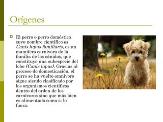 El documento habla sobre los orígenes y usos de los perros. Explica que los perros descienden de los lobos y fueron domesticados por los humanos. Ahora, los perros sirven para muchos propósitos como perros de compañía, guardia, caza, pastoreo, rescate, asistencia, policía y militares. También menciona algunas razas comunes para cada labor.