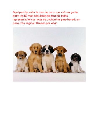 Este documento presenta una encuesta para votar por la raza de perro favorita entre las 50 razas de perro más populares del mundo, acompañadas de fotografías de cachorros para hacer la votación más divertida. Agradece a los lectores por participar en la encuesta.