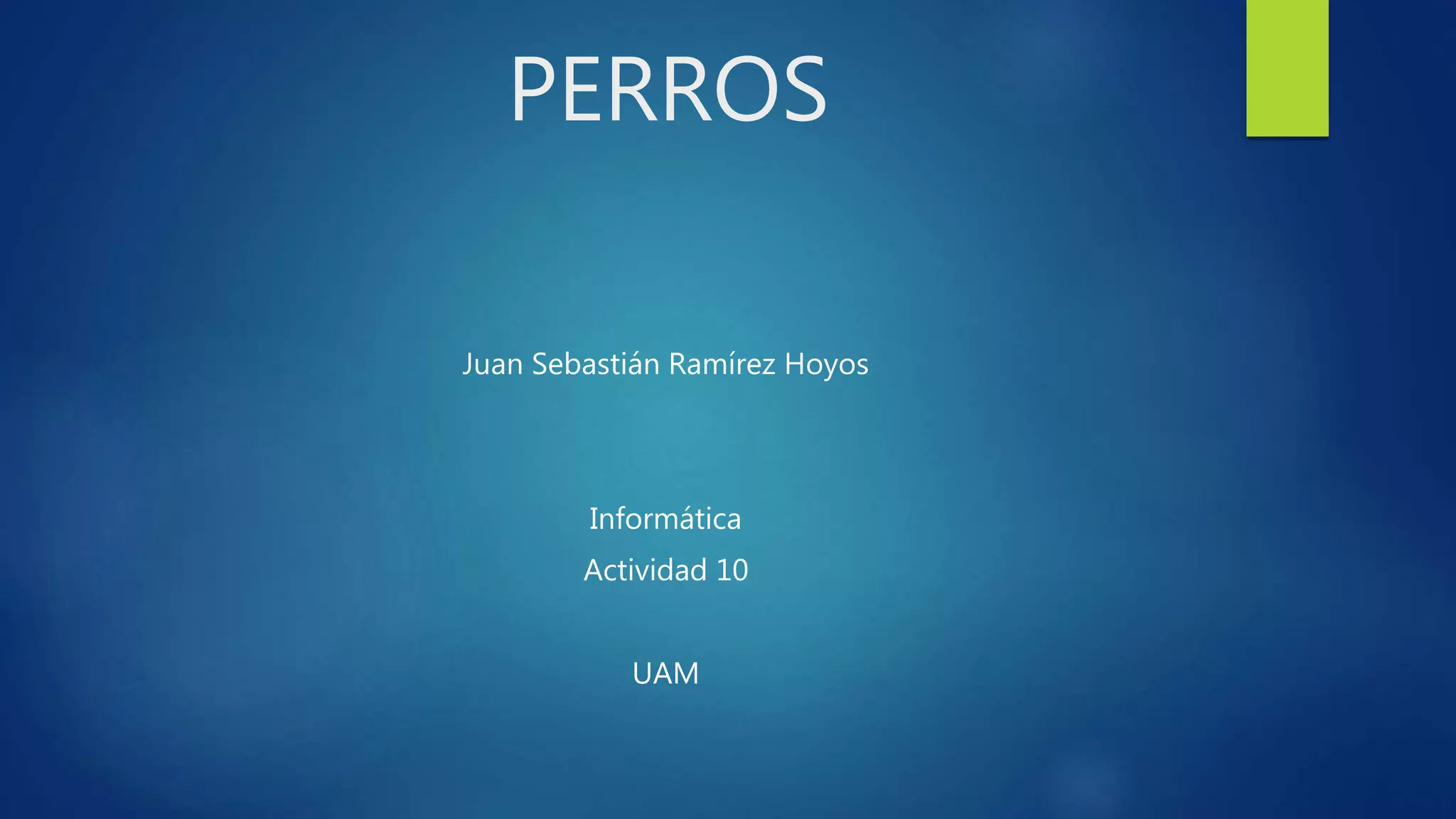 Este documento describe las características, historia, razas principales y algunos temas relacionados con los perros. Explica que los perros son mamíferos carnívoros domesticados a partir de lobos y que han estado asociados con los humanos durante miles de años. También cubre varias razas populares de perros, el proceso de adiestramiento, algunas enfermedades comunes y detalles sobre la gestación de los cachorros.