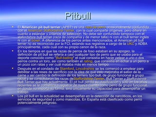 El American pit bull terrier es una raza de perro que se usaba originalmente para peleas contra toros y ratas. Aunque su definición cambió con el tiempo para enfocarse más en su forma que en su función, actualmente los pit bull se usan como perros de detección, seguridad y mascotas. Sin embargo, en España son considerados perros potencialmente peligrosos.