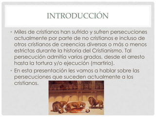 Este documento describe las persecuciones actuales que sufren los cristianos en diferentes partes del mundo. Explica que los cristianos son perseguidos principalmente debido a conflictos religiosos y que los países más peligrosos son Corea del Norte, Arabia Saudita y Afganistán. Presenta algunos casos específicos de persecución en Siria, Pakistán y Kenia a través de secuestros, arrestos y violencia física. Concluye esperando que algún día cesen las persecuciones contra personas por sus creencias religiosas.