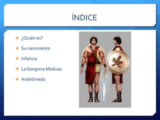 Perseo era el semidios hijo de Zeus y Danae. Tras su nacimiento, su abuelo Acrisio encerró a Danae y a Perseo en una caja que arrojó al mar. Llegaron a la isla de Serifos, donde creció Perseo. Polidectes se enamoró de Danae y envió a Perseo a matar a la Gorgona Medusa. Los dioses le dieron armas para la tarea. Perseo usó su escudo para matar a Medusa sin quedar convertido en piedra. Más tarde,