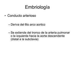 1) El conducto arterioso deriva del sexto arco aórtico fetal y se presenta en 1 de cada 2000 nacimientos.