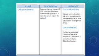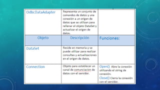 Este documento proporciona información sobre la persistencia de datos utilizando ODBC en VB.NET. Explica cómo importar System.Data.Odbc para conectarse a una base de datos, cómo crear objetos de conexión y comandos, y cómo ejecutar instrucciones SQL como insertar registros. También define conceptos clave como clases, objetos, DataGridView y proporciona código de ejemplo para establecer una conexión y realizar operaciones básicas en una base de datos.