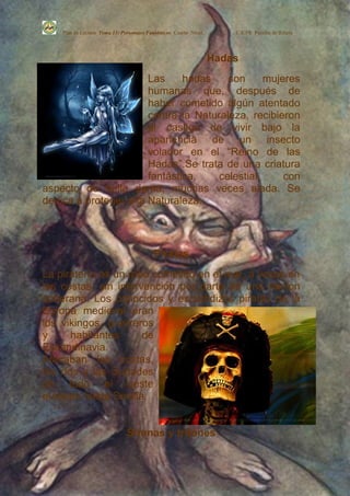 El documento describe varios personajes fantásticos incluyendo dragones, duendes, hadas, piratas, sirenas y tritones. Dragones son representados como grandes serpientes con cualidades mágicas, mientras que duendes son criaturas que protegen la naturaleza. Las hadas son mujeres humanas transformadas en insectos voladores que protegen la naturaleza. Sirenas son mujeres-pez con belleza y canto que atraen a los marineros.