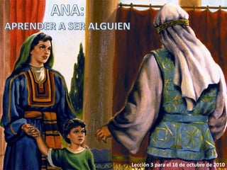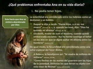 El documento describe los problemas que enfrentaba Ana en su vida, incluyendo su esterilidad y las burlas de su rival Penina. A pesar de esto, Ana derramó su alma ante Dios en oración. Después de recibir la bendición de Elí, Ana tuvo fe en que Dios había escuchado su petición. Ana preparó a su hijo Samuel durante tres años antes de entregarlo al servicio de Dios, enseñándole a distinguir entre el bien y el mal.