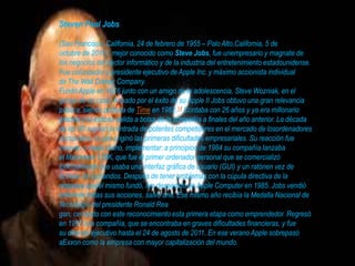 Este documento presenta información biográfica sobre varias figuras prominentes en el mundo de la tecnología e internet como Steve Jobs, Mark Zuckerberg, Kim Schmitz, y los fundadores de Google Larry Page y Sergey Brin. Describe los orígenes y logros empresariales de cada uno, incluyendo la fundación de Apple y Facebook, el pirateo de redes por parte de Kim Schmitz, y el éxito masivo de Google como el buscador más utilizado en el mundo.