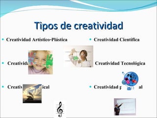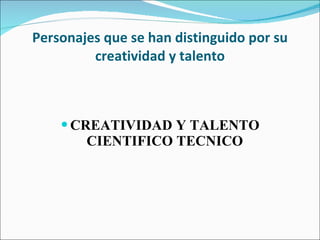 El documento describe diferentes tipos de creatividad como la artística, literaria, musical, científica y tecnológica. Luego menciona varios personajes históricos que se destacaron por su creatividad y logros en campos como la astronomía, las matemáticas, la física, la biología, la invención de sistemas de escritura, la comunicación, la ingeniería y el desarrollo tecnológico. Finalmente, también resalta las contribuciones de artistas, escritores, compositores y bail