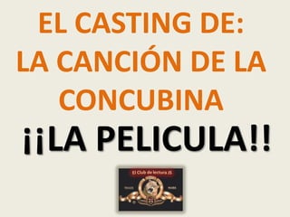 Este documento presenta un casting ficticio para una película basada en la novela "La canción de la concubina" del escritor Jaume Sanllorente. Se proponen diversos actores para interpretar los diferentes personajes de la novela y se plantean preguntas sobre sus caracterizaciones y la trama a Sanllorente.