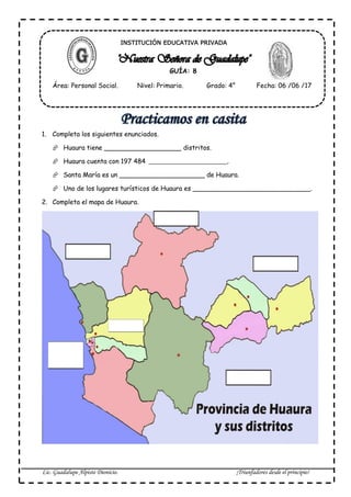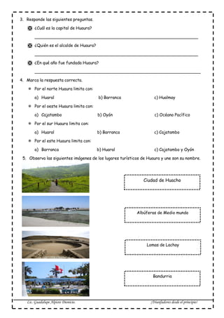 Este documento proporciona información sobre el distrito de Huaura en Perú. Pide que se complete información sobre el número de distritos de Huaura, su población, y lugares turísticos. También solicita que se identifique la capital de Huaura, su alcalde, y el año de su fundación. Finalmente, pide que se marquen las respuestas correctas sobre los límites de Huaura y que se unan imágenes de lugares turísticos con sus nombres correspondientes.