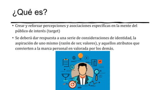 La creación de una marca personal implica definir la identidad, valores y objetivos de una persona para posicionarla de manera positiva en la mente del público objetivo. Esto incluye ser recordado, considerado y elegido por sobre la competencia. Se requiere establecer una estrategia de marketing personal para lograr visibilidad y generar confianza que permita diferenciarse.