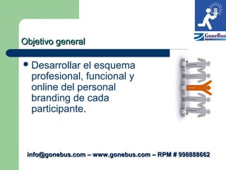 Este documento describe los objetivos y elementos clave del personal branding. Los objetivos generales son desarrollar el esquema profesional, funcional y en línea del personal branding de cada participante. Los objetivos específicos incluyen tener presencia en redes sociales, implementar marketing de contenidos, posicionamiento en internet, aprender a procesar imágenes y videos, implementar un curso en línea, y publicar información en línea ya que el internet es un mundo paralelo donde se debe estar presente.