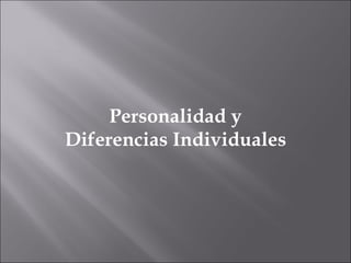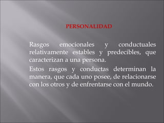 El documento habla sobre la personalidad y las diferencias individuales. Define la personalidad como rasgos emocionales y conductuales relativamente estables que determinan cómo una persona se relaciona con los demás. Explica que la personalidad está formada por características innatas y experiencias. También describe los tipos de personalidad A, B y C y las cinco grandes categorías de la personalidad: extroversión, afabilidad, dependencia, estabilidad emocional y cultura. Finalmente, resume varias evaluaciones proyectivas y escritas usadas para evaluar la personalidad.